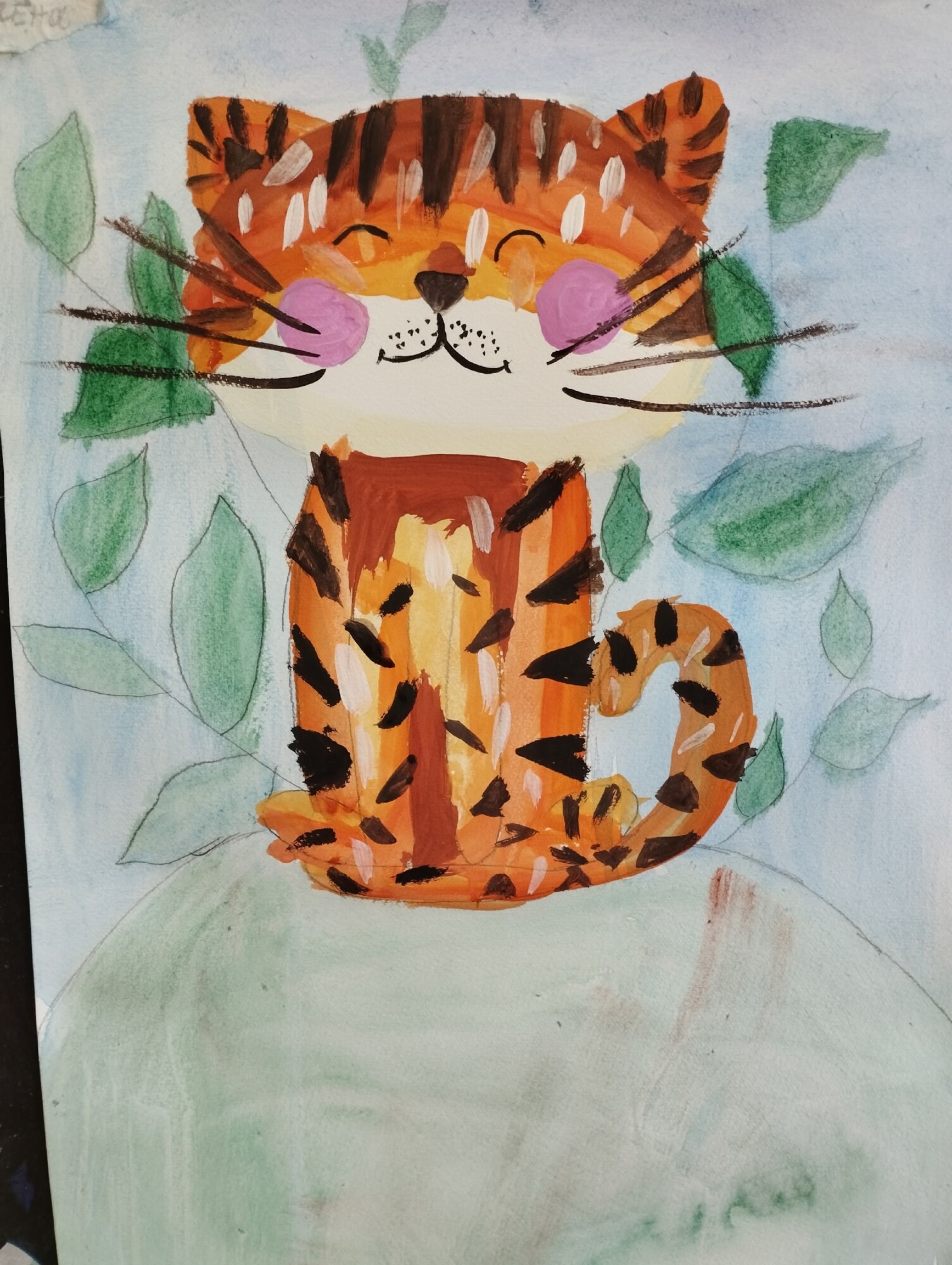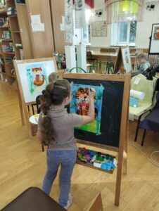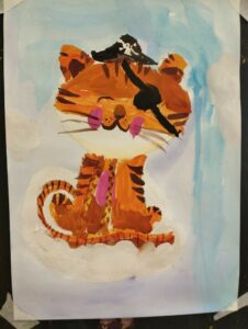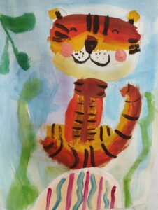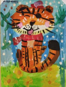 Сегодня группа 2 года обучения Студии активно работала с цветовым кругом, вспоминая основные группы цветов. Каждый этап работы предполагал использование цветов определённой группы: так, работу юные художники начали с холодных цветов (на фоне) . Продолжили тёплой цветовой гаммой, прорабатывая главного героя рисунка — огненного тигренка. И, наконец, завершили работу деталировкой, используя нейтральные цвета.